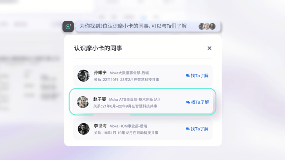 Moka Eva, based on the core capabilities of Moka Recruitment Management System and Moka People, is seamlessly integrated into various scenarios of HR's daily work, from recruitment to employee services to data statistics and analysis. It is committed to becoming the best AI HR partner for enterprises, improving HR work efficiency by 10 times.